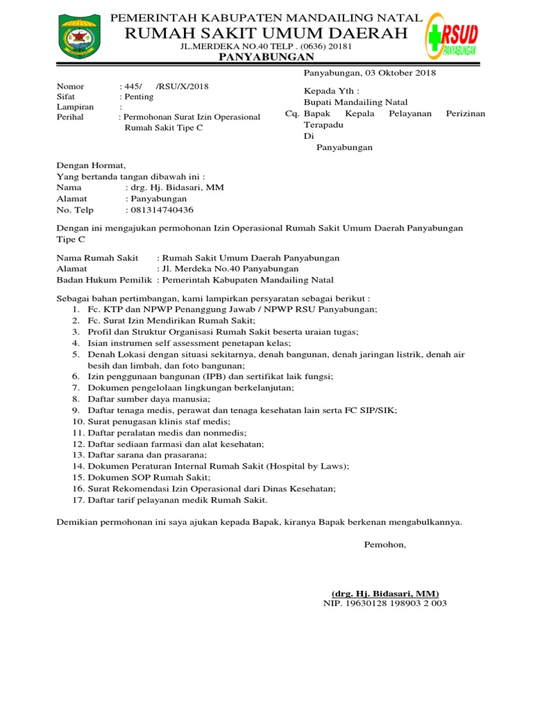 Contoh Surat Contoh Surat Izin Operasional Rumah Sakit